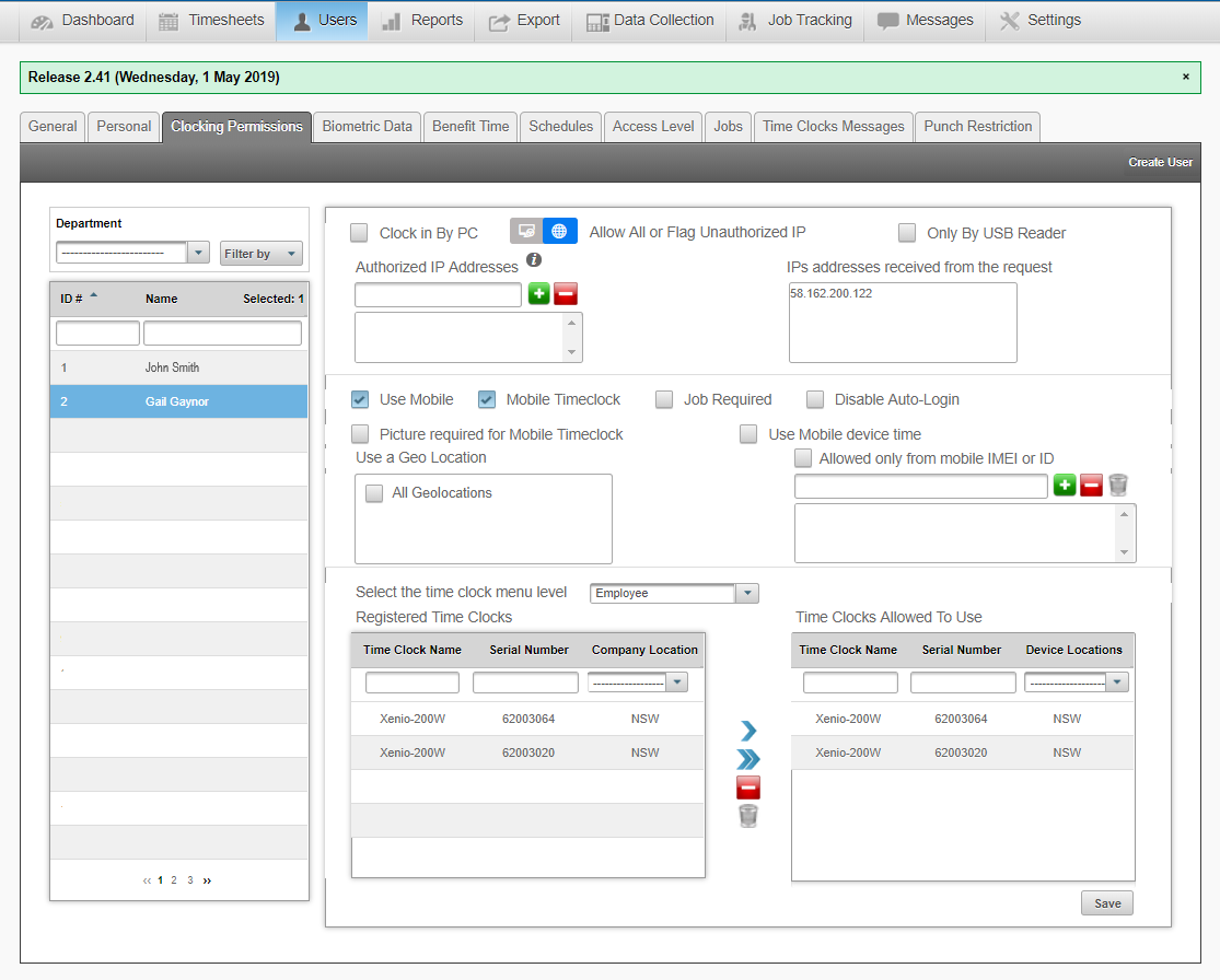 - Select the Registered Time Clocks (Devices) that you wish the person to be Administrator or Manager of and press the blue arrow so they will now appear under Time Clocks Allowed to Use and Save.