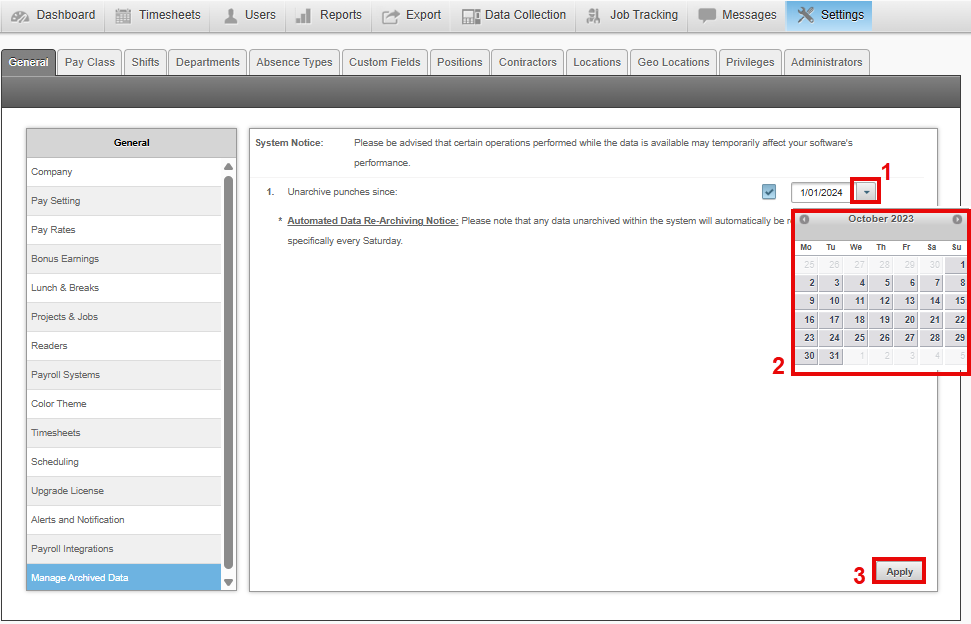 1. Go to Settings > General > Manage Archived Data > Tick the "Unarchive punches since:"